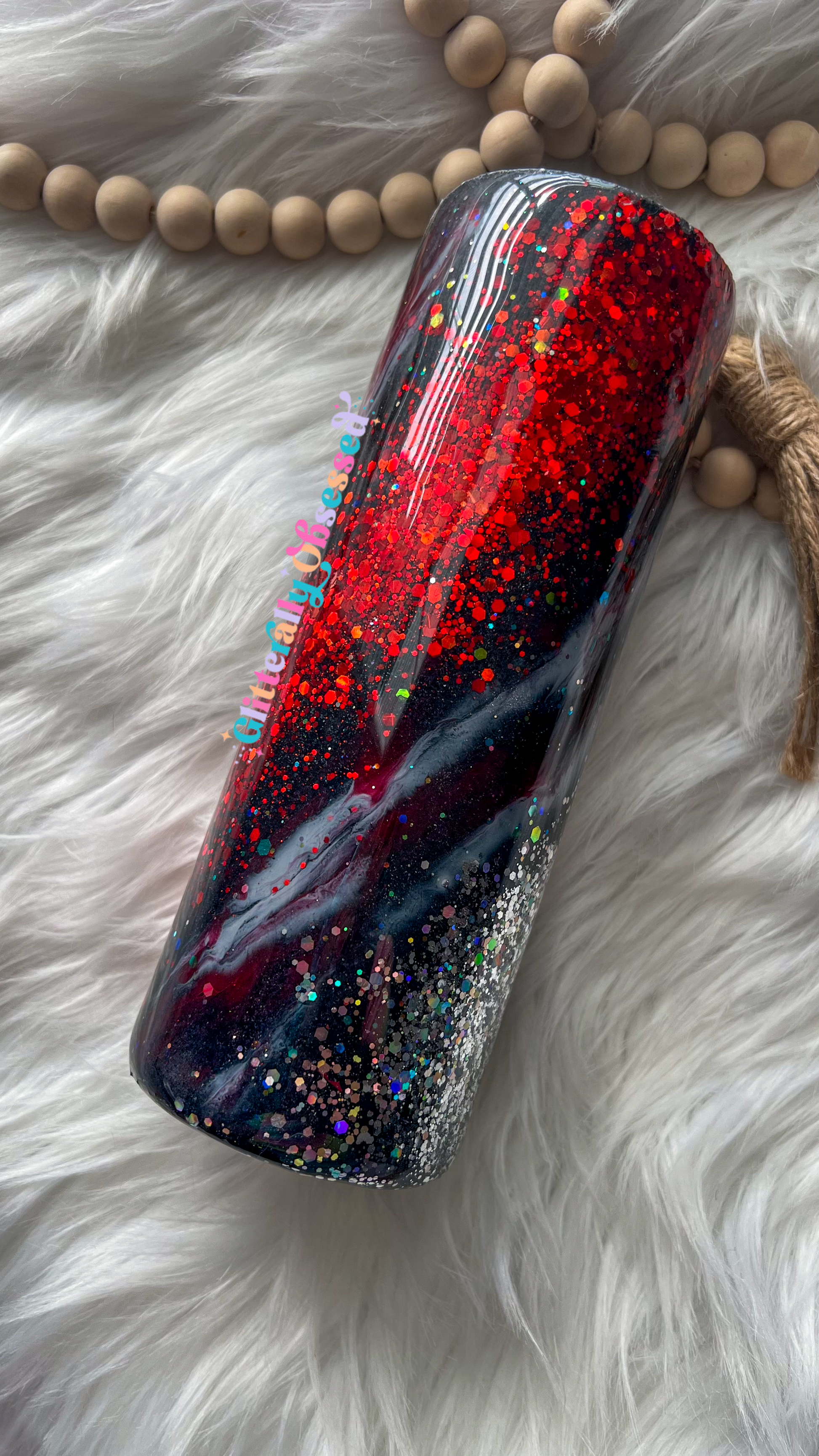 Please remember all tumblers are glittered by hand. Every cup will be unique in its own way and slightly different from the other. No two cups will ever be the same. As with all handmade items, there may be slight imperfections, but this in no way affects the use or quality of the tumbler. We offer multiple cup sizes so each design will look slightly different on each tumbler.