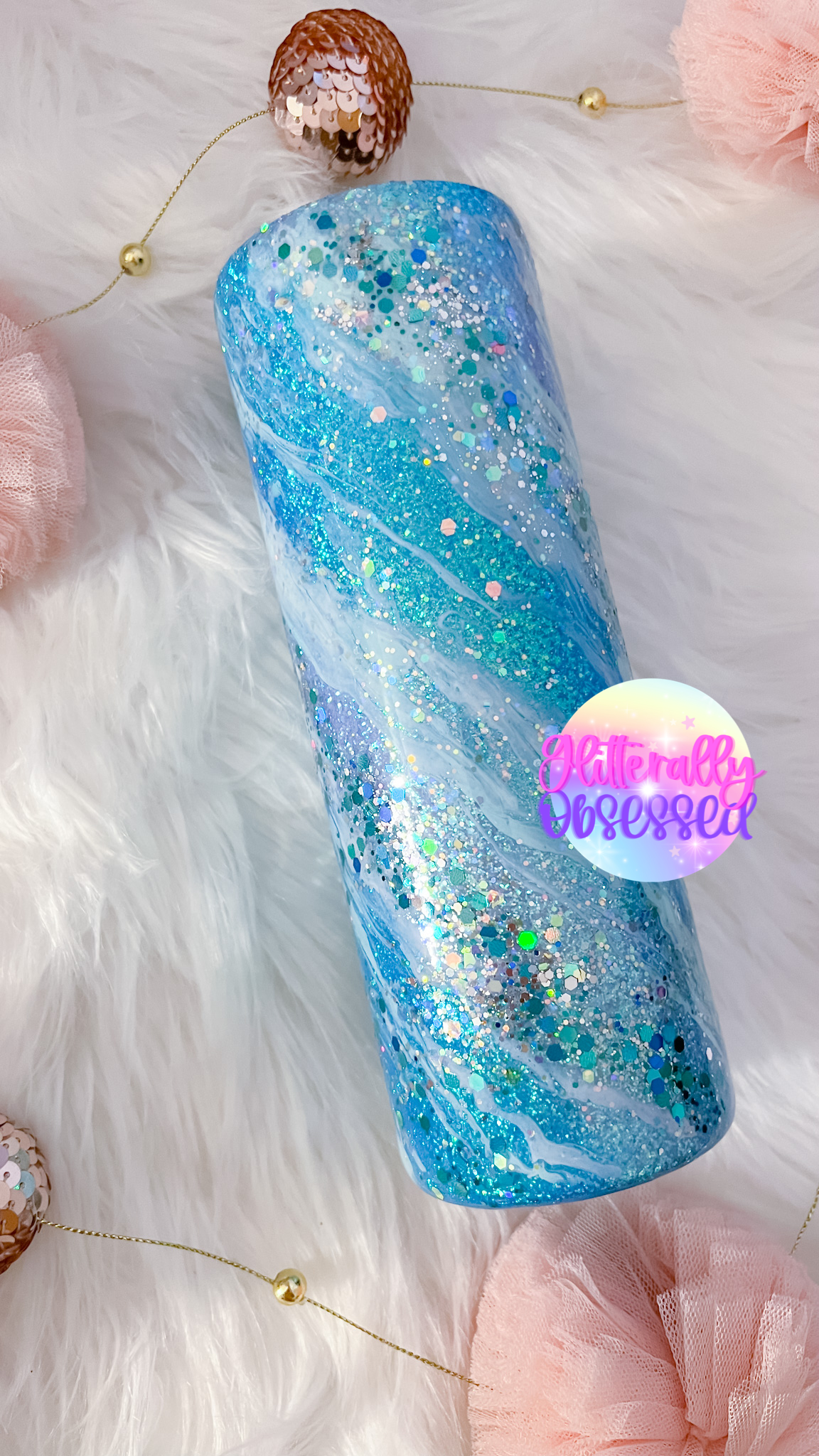 Every Glitterally Obsessed tumbler is handmade with real glitter to give you the most sparkle! All of our tumblers are doubled walled stainless steel tumblers, these tumblers keep your drinks cold / hot much longer and do not sweat. Once completed every tumbler is coated in layers of FDA compliant food safe epoxy. This gives each tumbler a high gloss glass like brilliant smooth finish. Once the epoxy is fully cured the glitter will not come off or flake. Each tumbler comes branded with Glitterally Obsessed on the bottom of the cup to ensure you have a one of a kind custom cup made directly by us. Please remember that these cups will look similar to the listing picture, but sometimes glitter placement and the swirls lines may flow in the opposite direction. If you purchase a cup with decals they are placed underneath epoxy to ensure it stays. Before send off each tumbler is thoroughly inspected one last time & will have pictures and videos taken prior to confirm perfect condition before your item arrives. Every tumbler purchase comes with a tumbler lid, reusable straw, tumbler care instructions, and a complimentary gift.