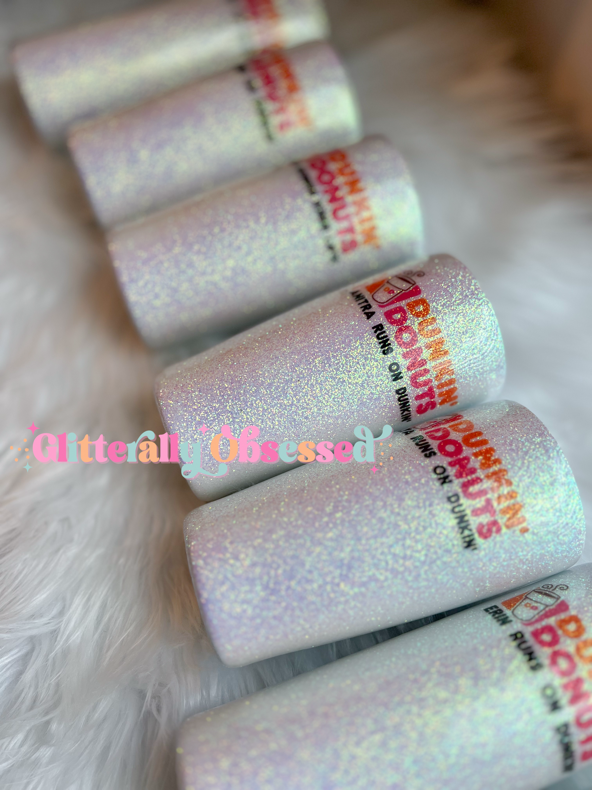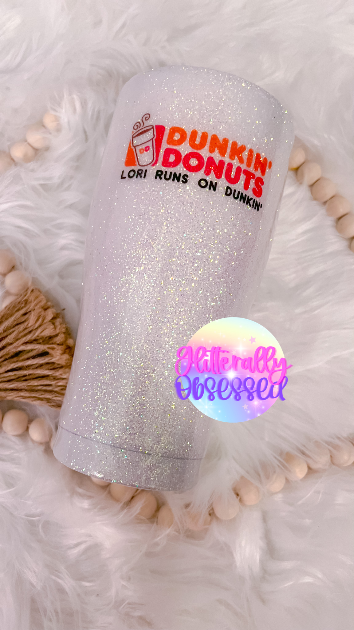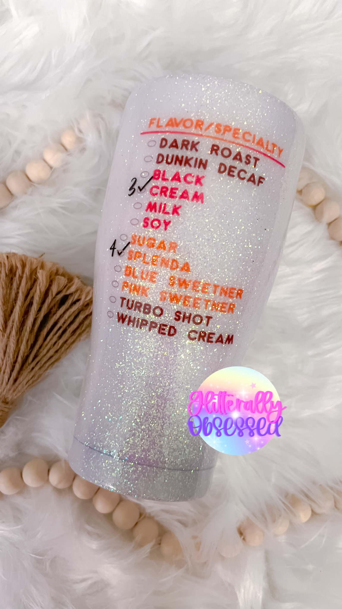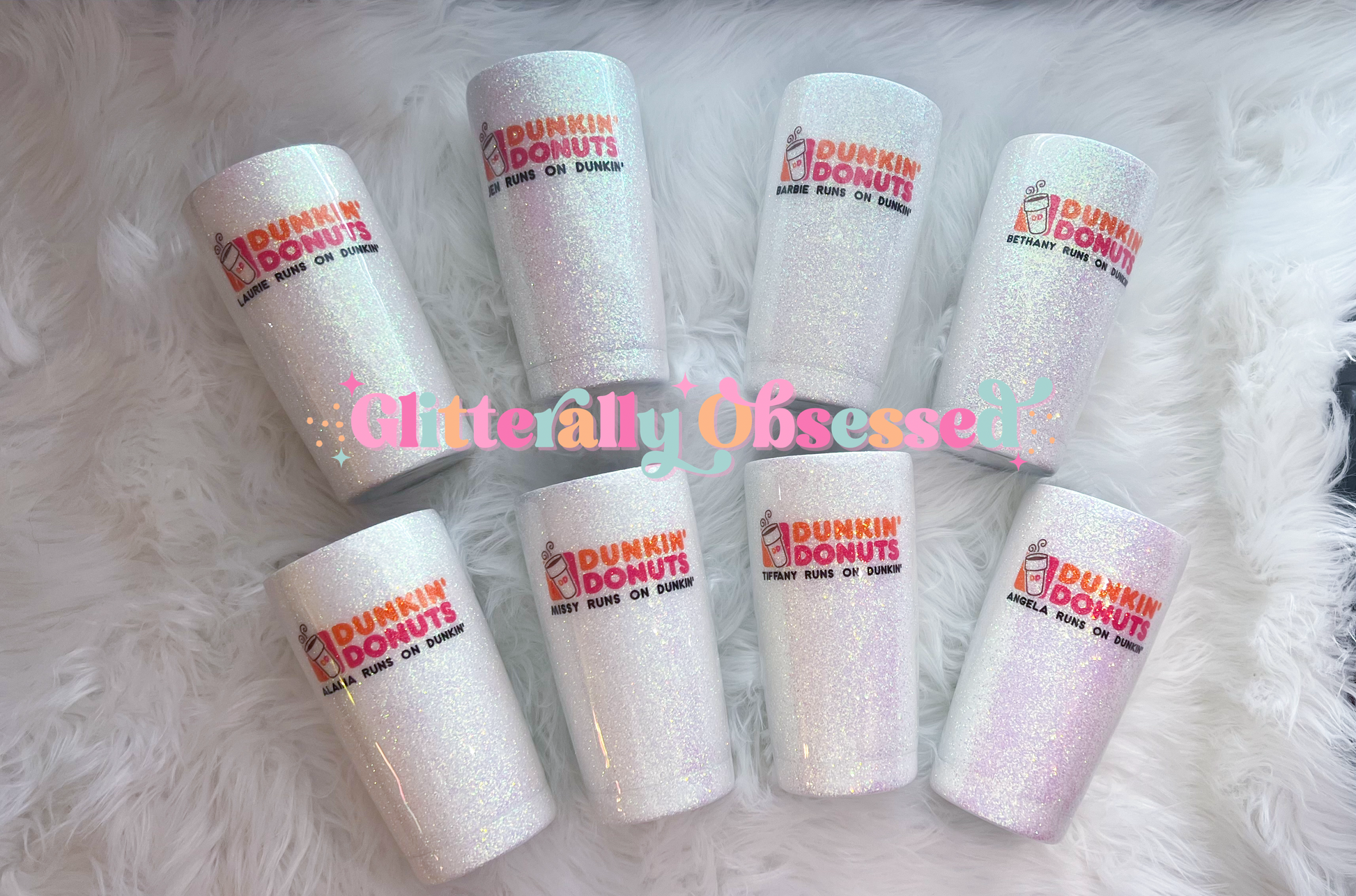 Please remember all tumblers are glittered by hand. Every cup will be unique in its own way and slightly different from the other. No two cups will ever be the same. As with all handmade items, there may be slight imperfections, but this in no way affects the use or quality of the tumbler. We offer multiple cup sizes so each design will look slightly different on each tumbler.