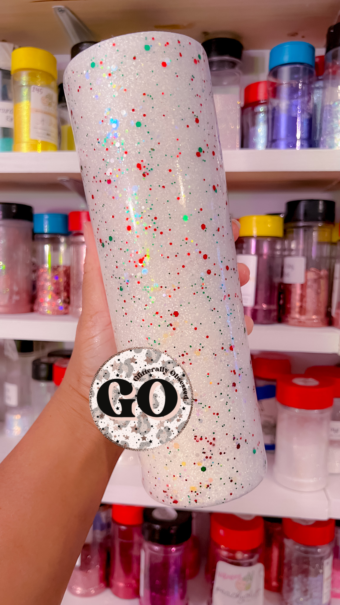 Please remember all tumblers are glittered by hand. Every cup will be unique in its own way and slightly different from the other. No two cups will ever be the same. As with all handmade items, there may be slight imperfections, but this in no way affects the use or quality of the tumbler. We offer multiple cup sizes so each design will look slightly different on each tumbler.