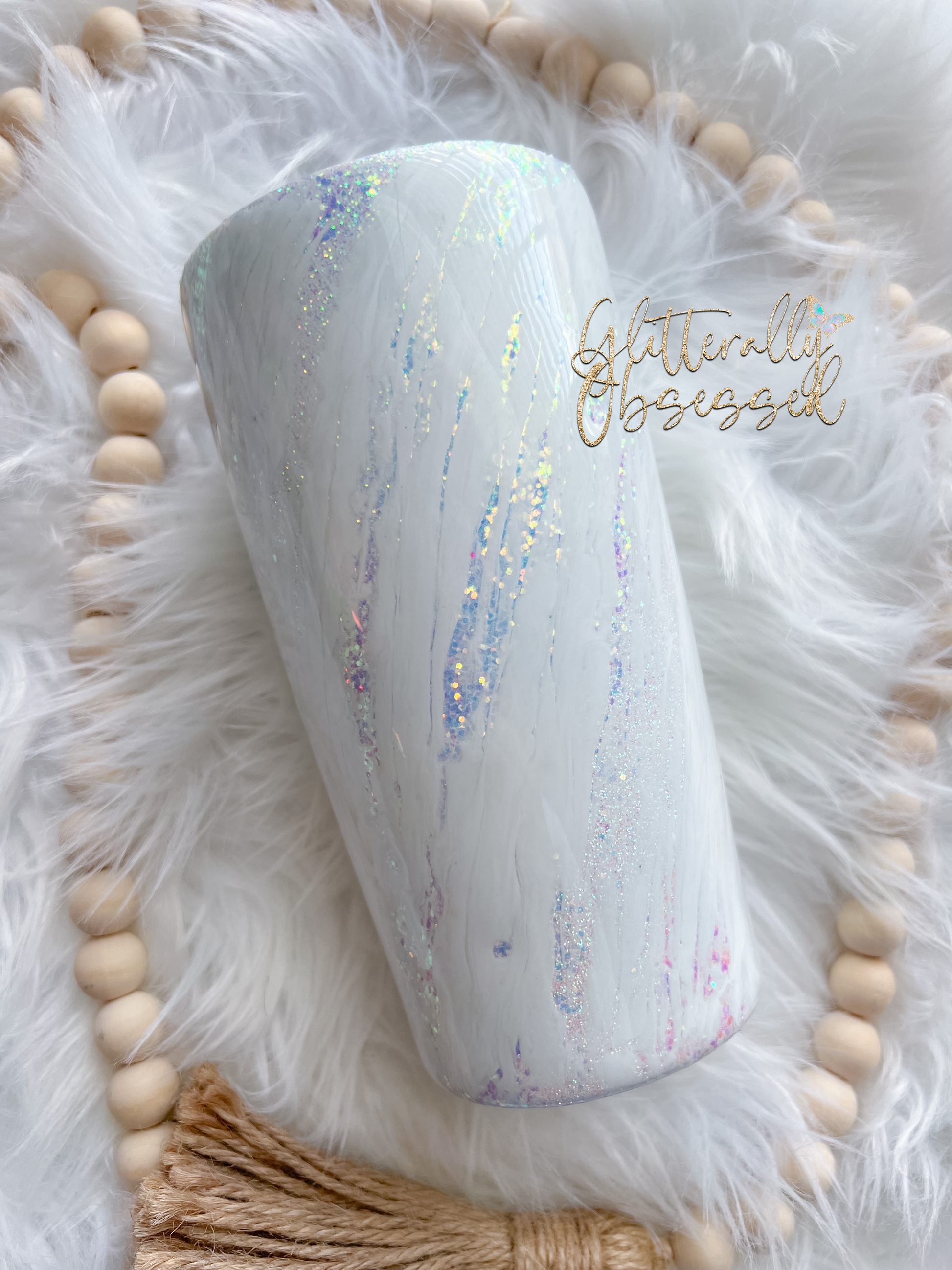 Please remember all tumblers are glittered by hand. Every cup will be unique in its own way and slightly different from the other. No two cups will ever be the same. As with all handmade items, there may be slight imperfections, but this in no way affects the use or quality of the tumbler. We offer multiple cup sizes so each design will look slightly different on each tumbler.