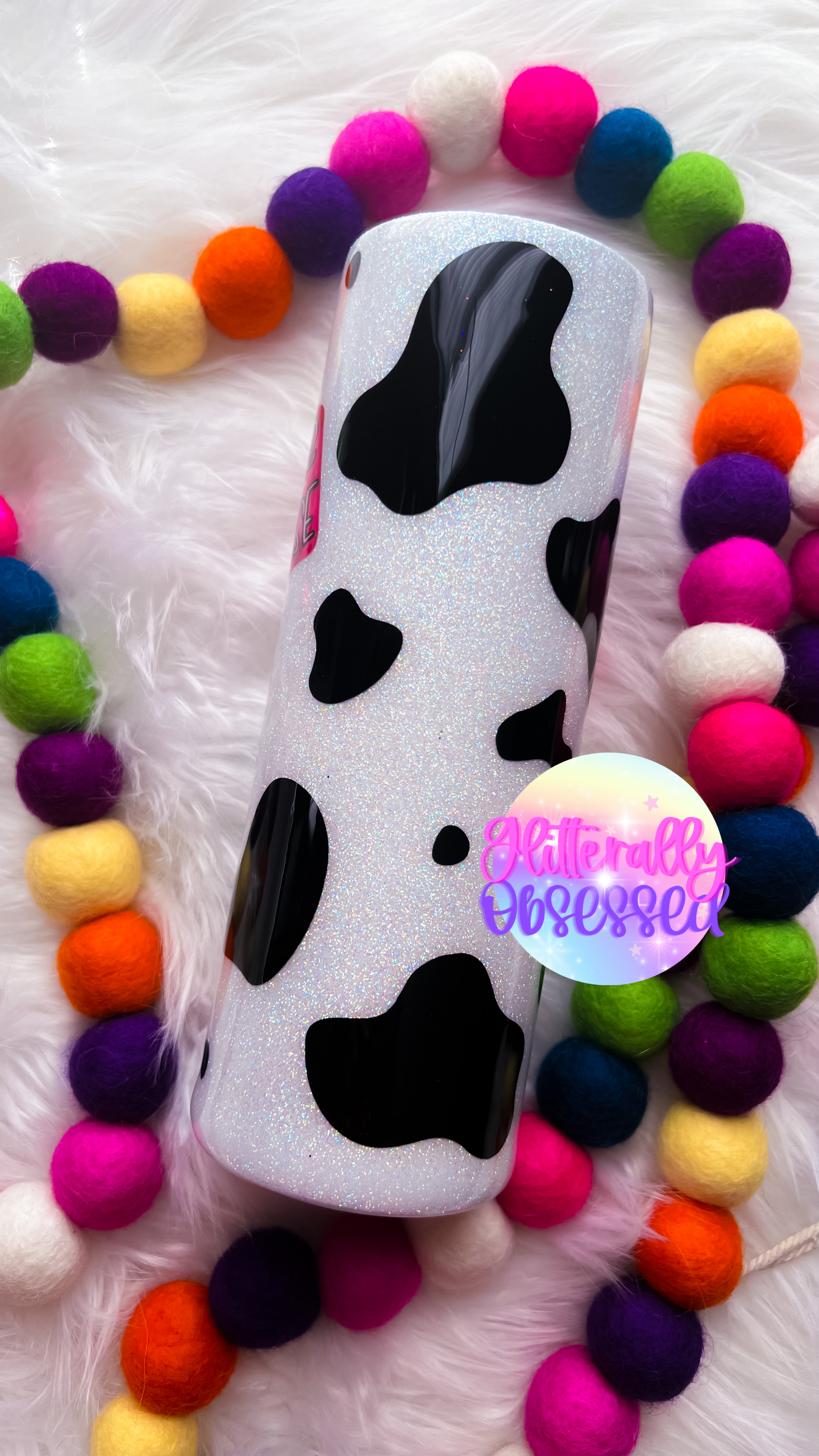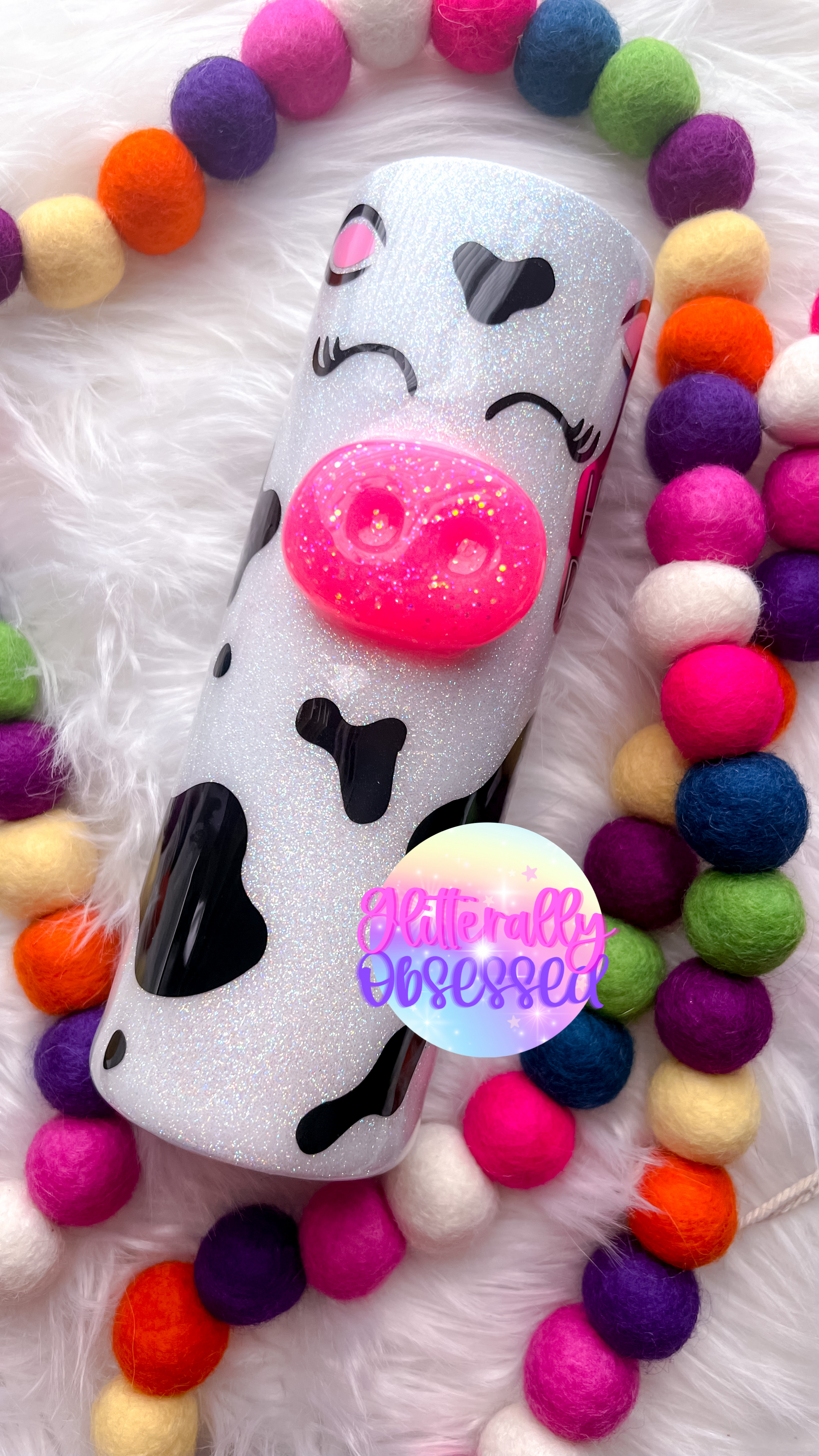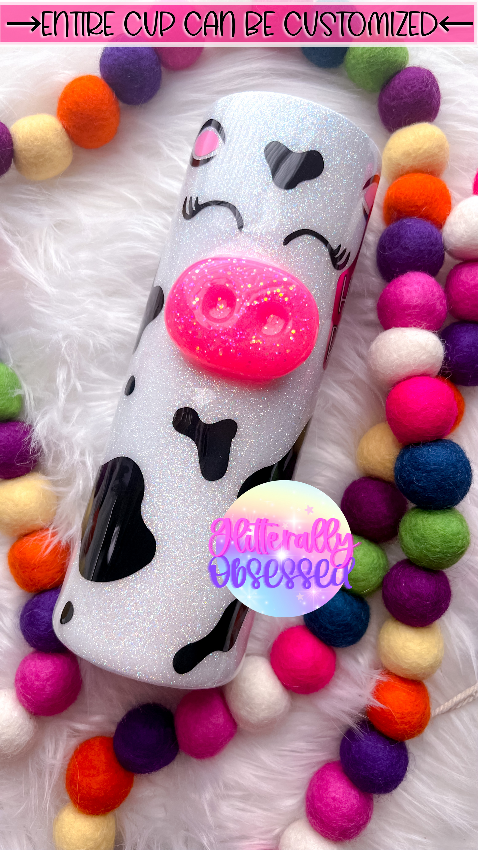 Entire cup can be changed: nose glitter color, cow tag color + font (cup can be personalized with a name or monogram instead of “heifer please”, cow spot color & tumbler glitter color