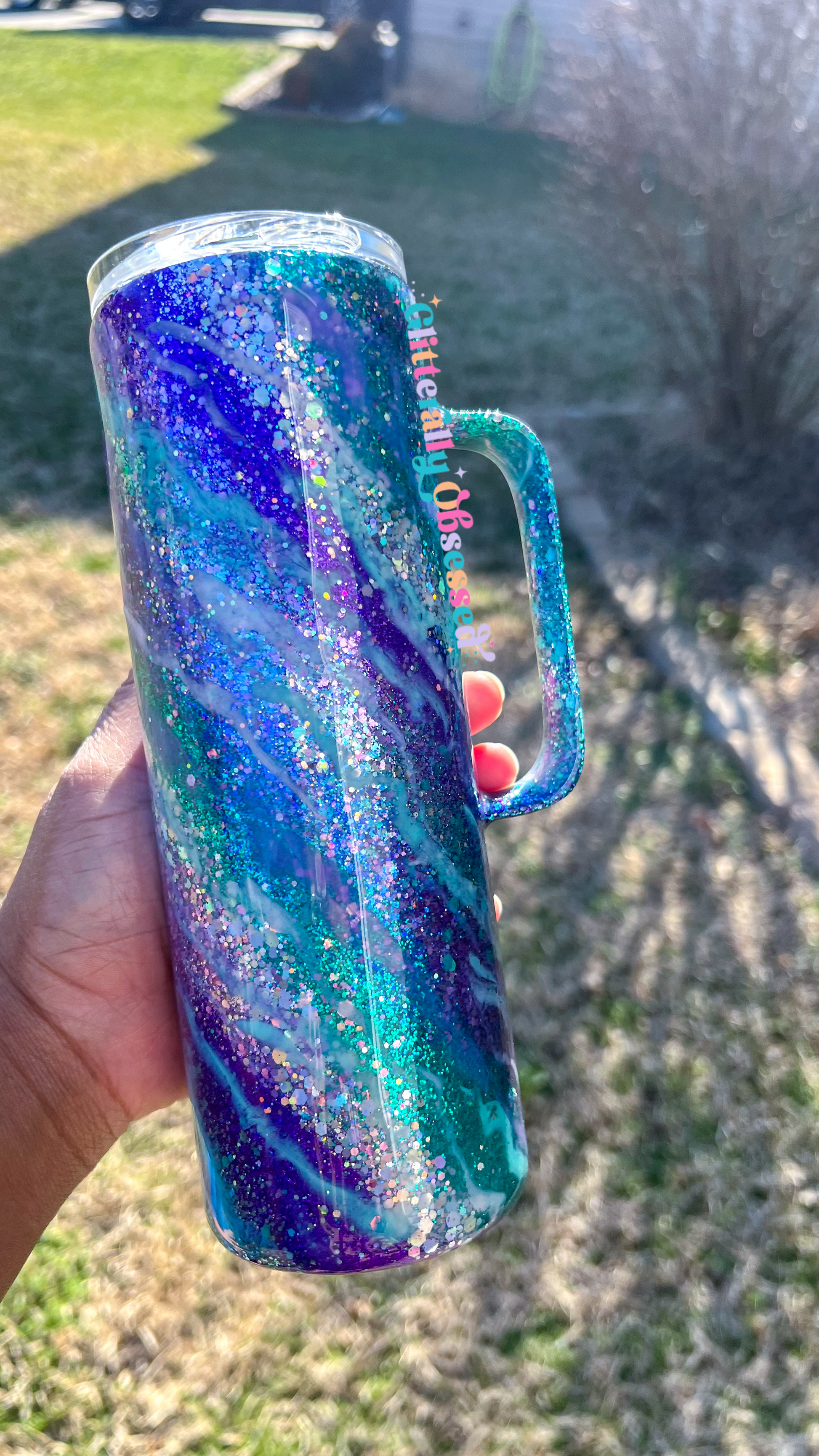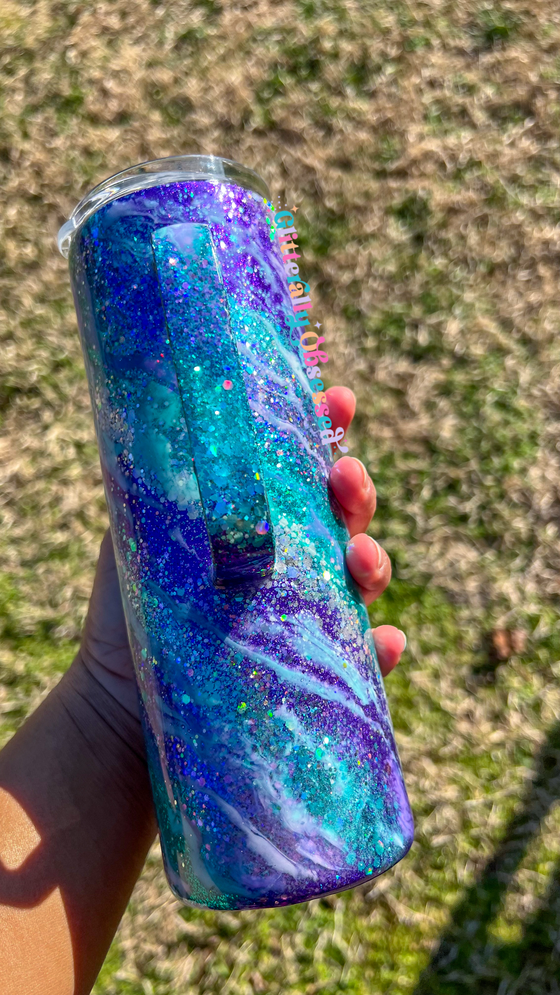 Every Glitterally Obsessed tumbler is handmade with real glitter to give you the most sparkle! All of our tumblers are doubled walled stainless steel tumblers, these tumblers keep your drinks cold / hot much longer and do not sweat. Once completed every tumbler is coated in layers of FDA compliant food safe epoxy. This gives each tumbler a high gloss glass like brilliant smooth finish. Once the epoxy is fully cured the glitter will not come off or flake. Each tumbler comes branded with Glitterally Obsessed on the bottom of the cup to ensure you have a one of a kind custom cup made directly by us. Please remember that these cups will look similar to the listing picture, but sometimes glitter placement and the swirls lines may flow in the opposite direction. If you purchase a cup with decals they are placed underneath epoxy to ensure it stays. Before send off each tumbler is thoroughly inspected one last time & will have pictures and videos taken prior to confirm perfect condition before your item arrives. Every tumbler purchase comes with a tumbler lid, reusable straw, tumbler care instructions, and a complimentary gift.