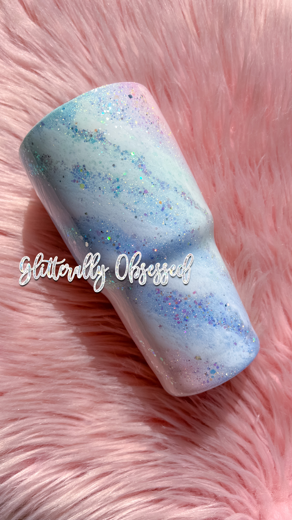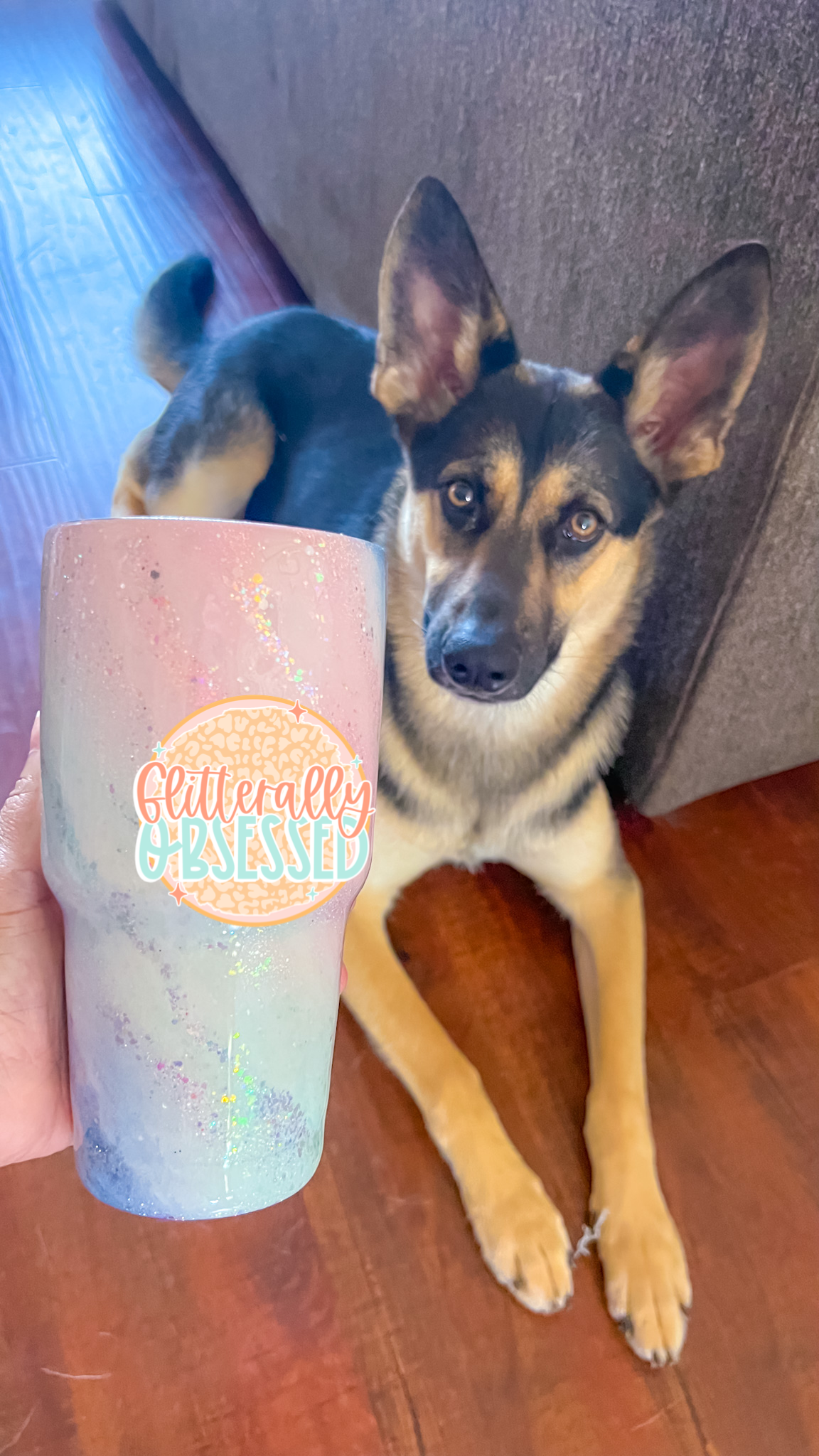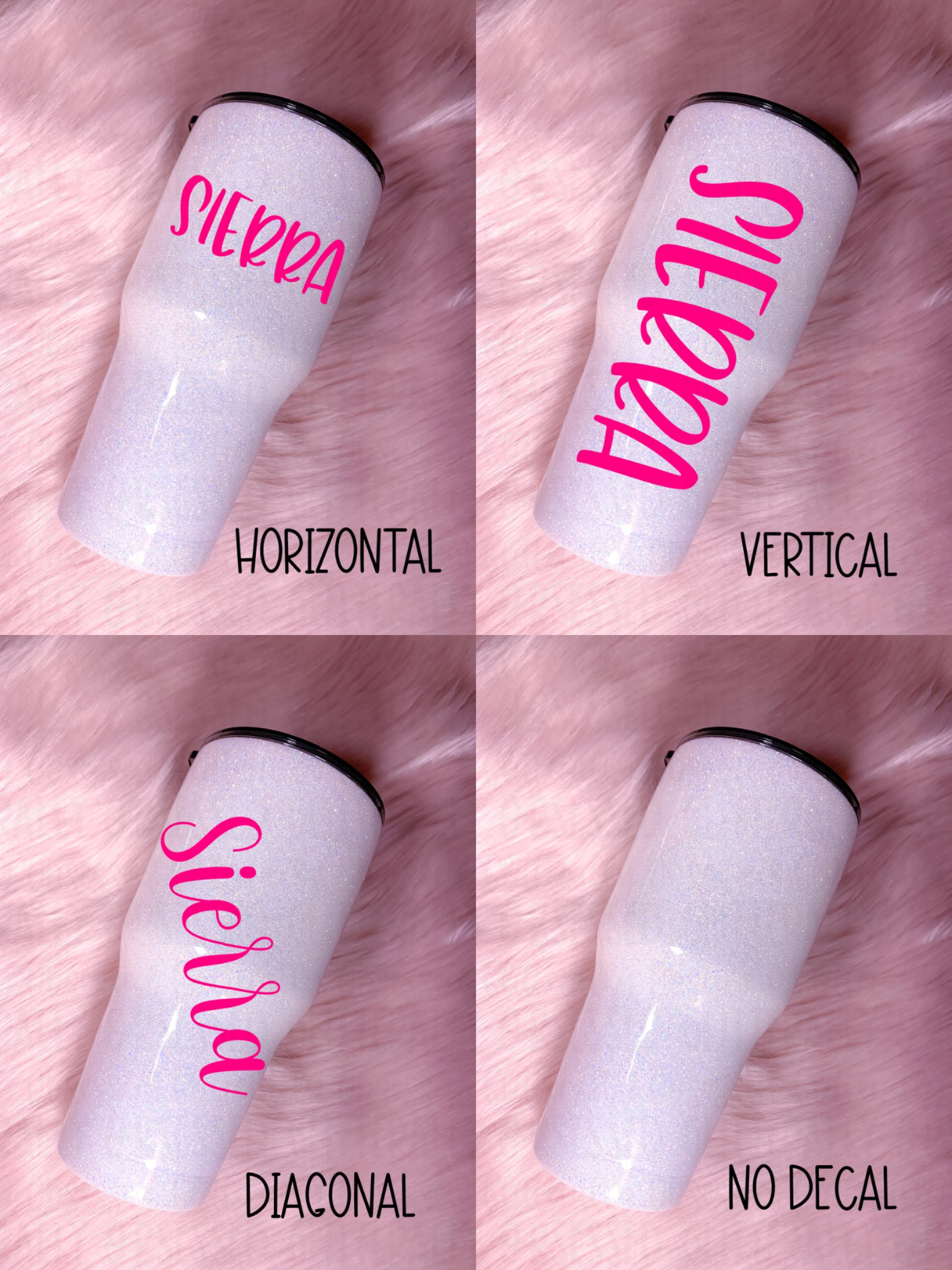 Please remember all tumblers are glittered by hand. Every cup will be unique in its own way and slightly different from the other. No two cups will ever be the same. As with all handmade items, there may be slight imperfections, but this in no way affects the use or quality of the tumbler. We offer multiple cup sizes so each design will look slightly different on each tumbler.