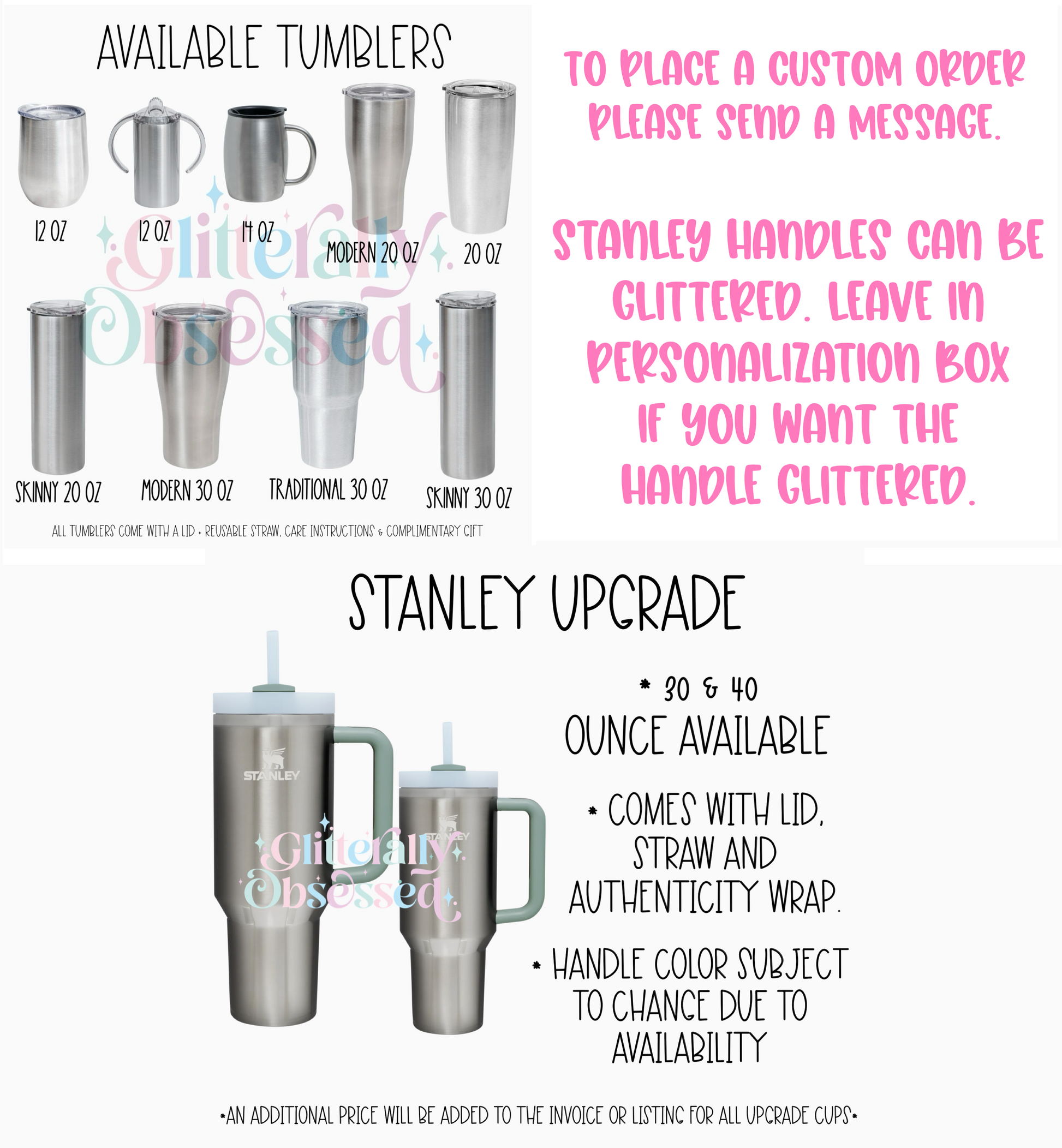 Every Glitterally Obsessed tumbler is handmade with real glitter to give you the most sparkle! All of our tumblers are doubled walled stainless steel tumblers, these tumblers keep your drinks cold / hot much longer and do not sweat. Once completed every tumbler is coated in layers of FDA compliant food safe epoxy. This gives each tumbler a high gloss glass like brilliant smooth finish. Once the epoxy is fully cured the glitter will not come off or flake. Each tumbler comes branded with Glitterally Obsessed on the bottom of the cup to ensure you have a one of a kind custom cup made directly by us. If you purchase a cup with decals they are placed underneath epoxy to ensure it stays. Before send off each tumbler is thoroughly inspected one last time & will have pictures and videos taken prior to confirm perfect condition before your item arrives. Every tumbler purchase comes with a tumbler lid, reusable straw, tumbler care instructions, and a complimentary gift.