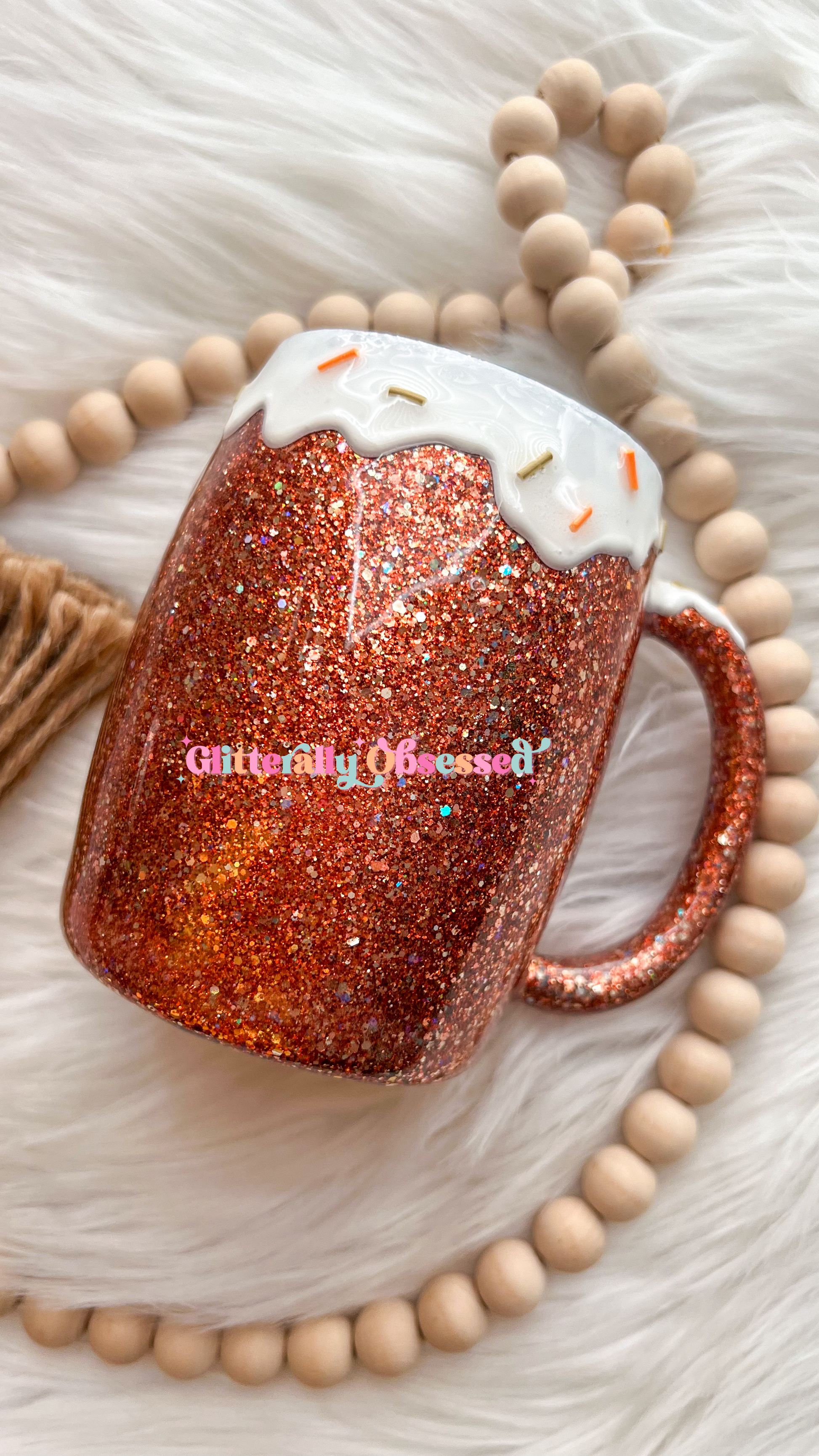 Please remember all tumblers are glittered by hand. Every cup will be unique in its own way and slightly different from the other. No two cups will ever be the same. As with all handmade items, there may be slight imperfections, but this in no way affects the use or quality of the tumbler. We offer multiple cup sizes so each design will look slightly different on each tumbler.