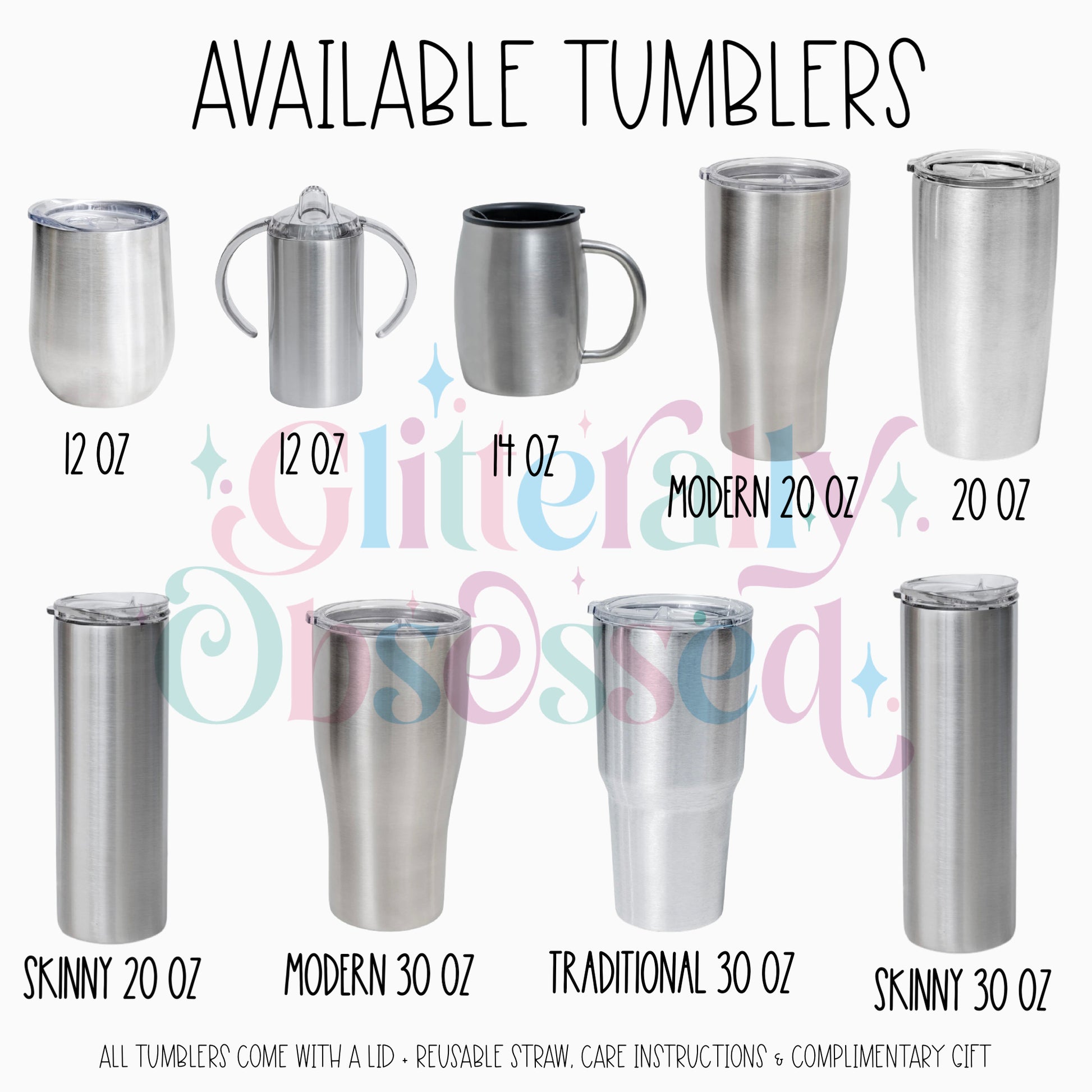Every Glitterally Obsessed tumbler is handmade with real glitter to give you the most sparkle! All of our tumblers are doubled walled stainless steel tumblers, these tumblers keep your drinks cold / hot much longer and do not sweat. Once completed every tumbler is coated in layers of FDA compliant food safe epoxy. This gives each tumbler a high gloss glass like brilliant smooth finish. Once the epoxy is fully cured the glitter will not come off or flake. Each tumbler comes branded with Glitterally Obsessed on the bottom of the cup to ensure you have a one of a kind custom cup made directly by us. If you purchase a cup with decals they are placed underneath epoxy to ensure it stays. Before send off each tumbler is thoroughly inspected one last time & will have pictures and videos taken prior to confirm perfect condition before your item arrives. Every tumbler purchase comes with a tumbler lid, reusable straw, tumbler care instructions, and a complimentary gift.