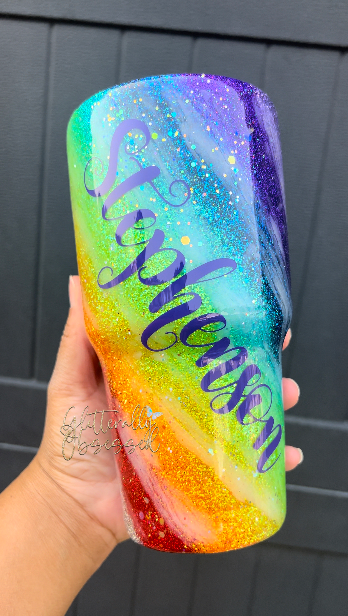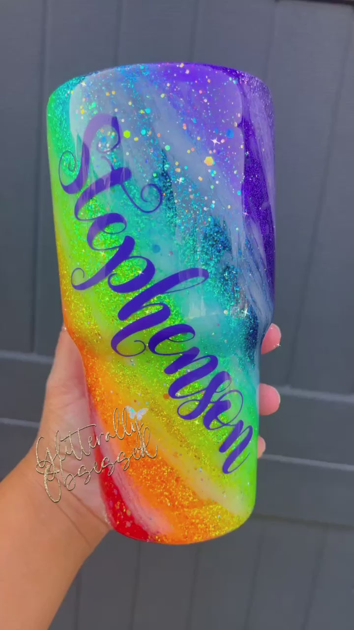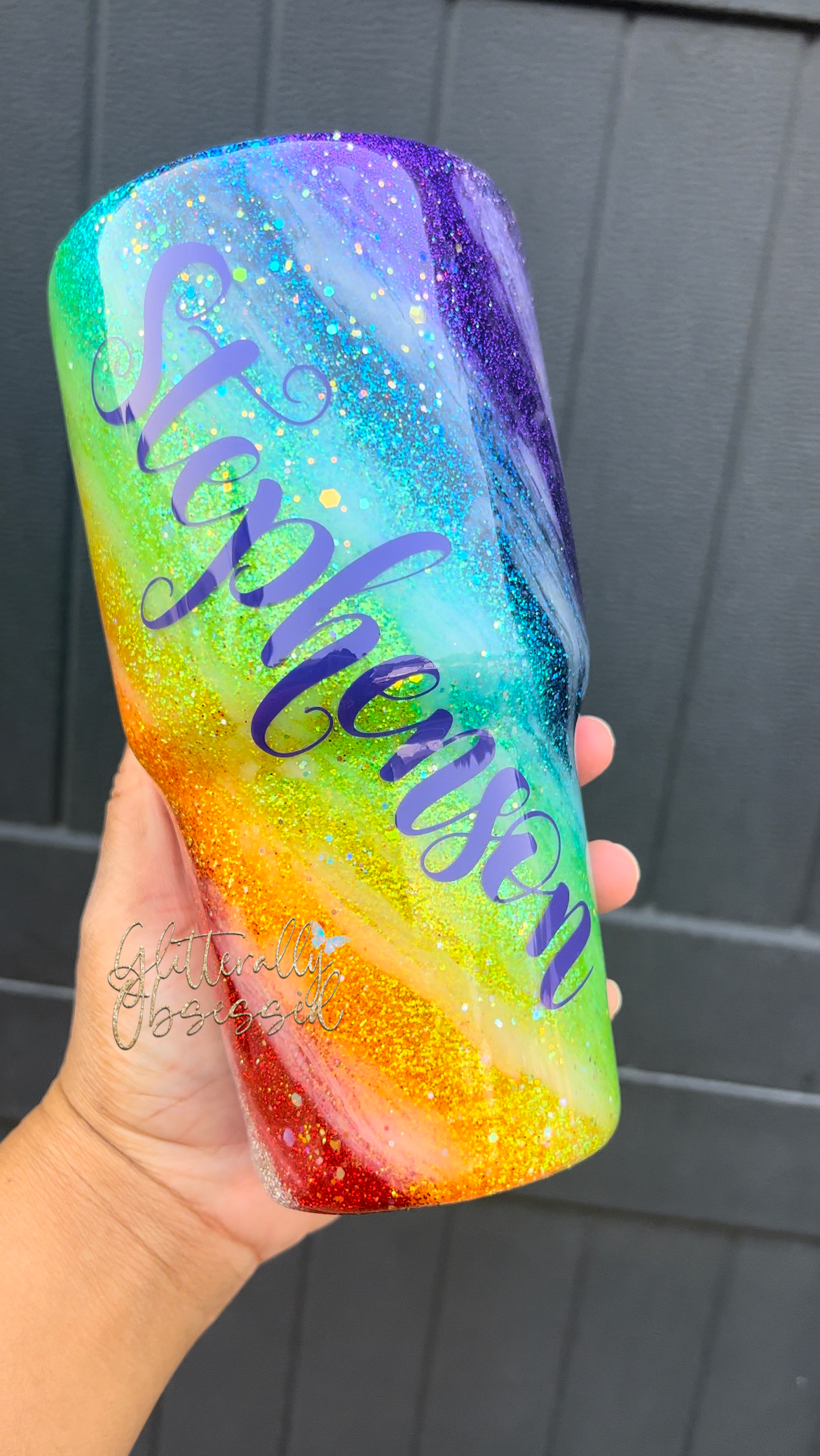 Every Glitterally Obsessed tumbler is handmade with real glitter to give you the most sparkle! All of our tumblers are doubled walled stainless steel tumblers, these tumblers keep your drinks cold / hot much longer and do not sweat. Once completed every tumbler is coated in layers of FDA compliant food safe epoxy. This gives each tumbler a high gloss glass like brilliant smooth finish. Once the epoxy is fully cured the glitter will not come off or flake. Each tumbler comes branded with Glitterally Obsessed on the bottom of the cup to ensure you have a one of a kind custom cup made directly by us. If you purchase a cup with decals they are placed underneath epoxy to ensure it stays. Milky way cups are unique and each one will look different. Please remember that these cups will look similar to the listing picture, but sometimes glitter placement and the swirls lines may flow in the opposite direction. Before send off each tumbler is thoroughly inspected one last time & will have pictures and videos taken prior to confirm perfect condition before your item arrives. Every tumbler purchase comes with a tumbler lid, reusable straw, tumbler care instructions, and a complimentary gift.