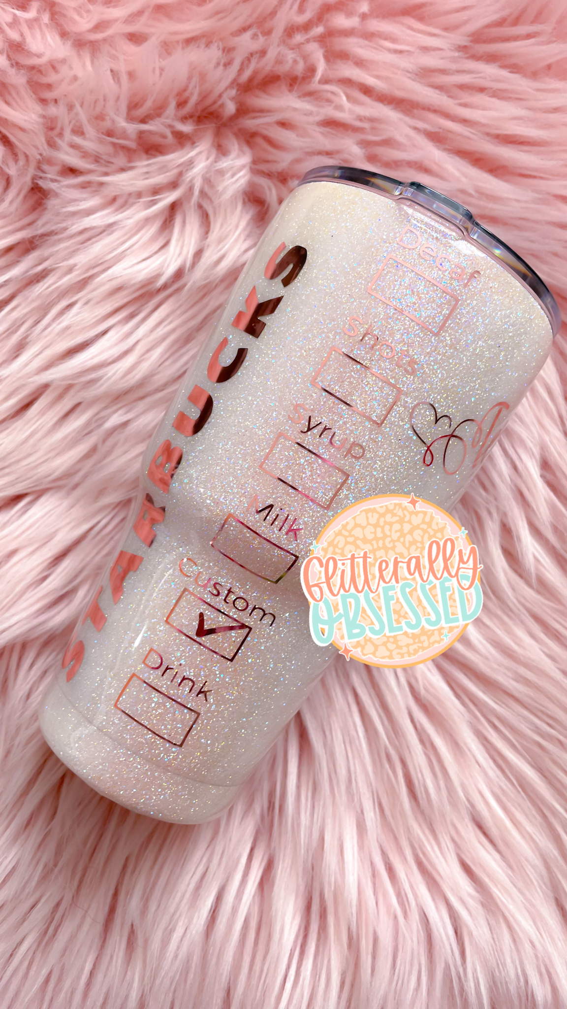 Please remember all tumblers are glittered by hand. Every cup will be unique in its own way and slightly different from the other. No two cups will ever be the same. As with all handmade items, there may be slight imperfections, but this in no way affects the use or quality of the tumbler. We offer multiple cup sizes so each design will look slightly different on each tumbler.