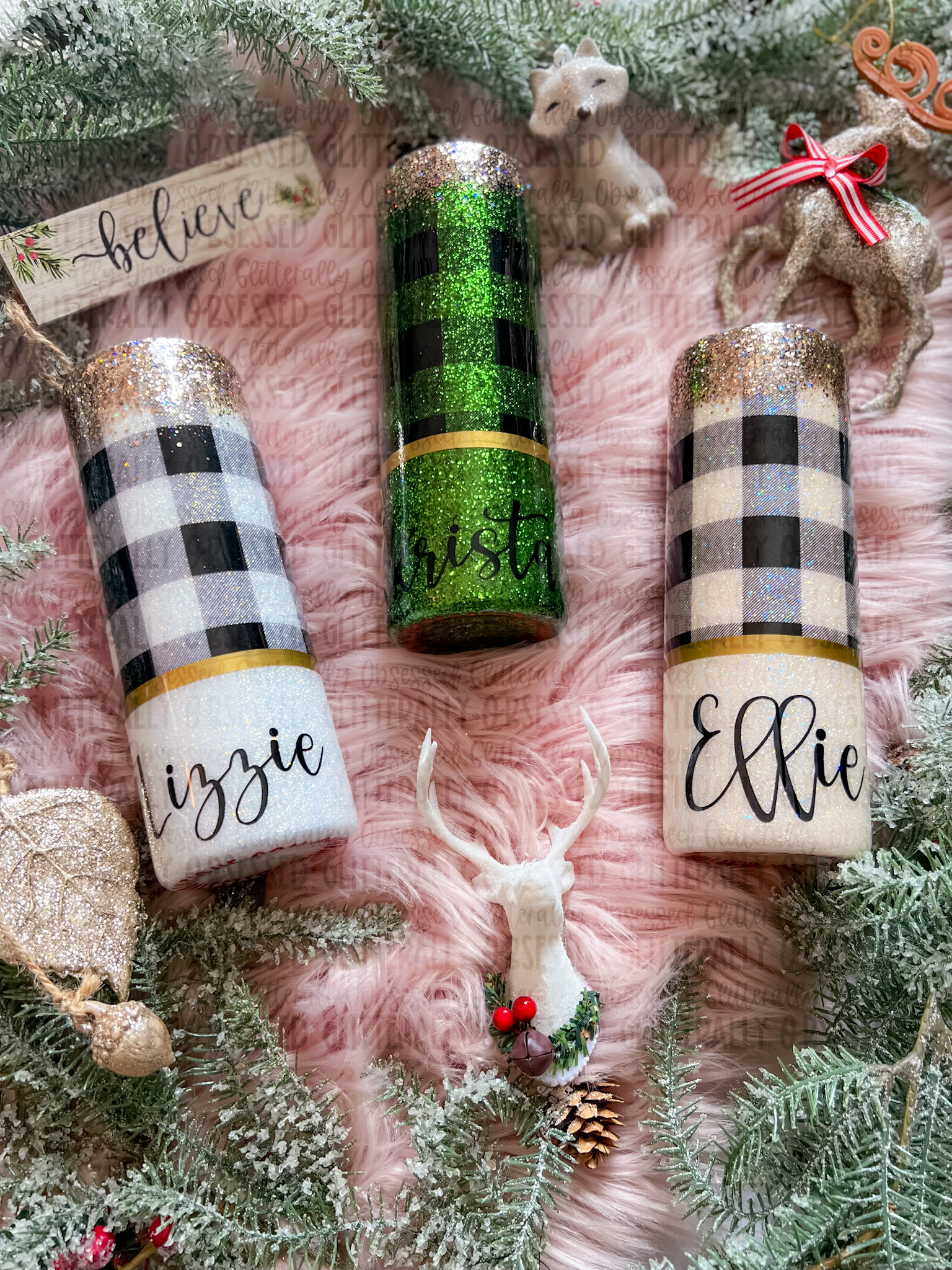 Please remember all tumblers are glittered by hand. Every cup will be unique in its own way and slightly different from the other. No two cups will ever be the same. As with all handmade items, there may be slight imperfections, but this in no way affects the use or quality of the tumbler. We offer multiple cup sizes so each design will look slightly different on each tumbler.