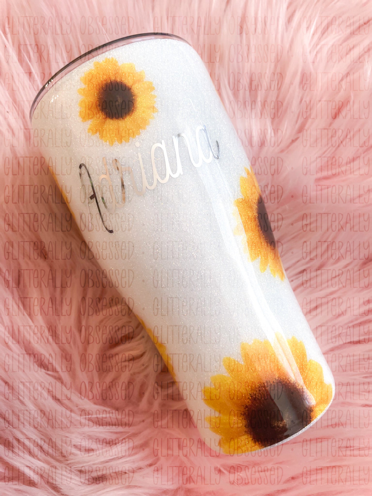 Please remember all tumblers are glittered by hand. Every cup will be unique in its own way and slightly different from the other. No two cups will ever be the same. As with all handmade items, there may be slight imperfections, but this in no way affects the use or quality of the tumbler. We offer multiple cup sizes so each design will look slightly different on each tumbler.